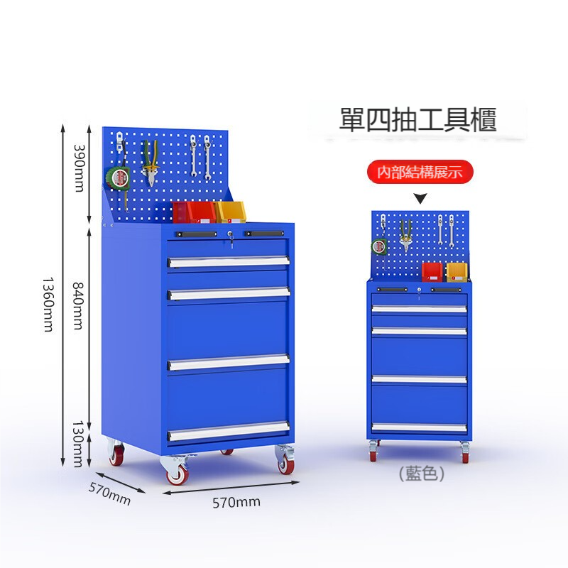 產品名稱 : 藍色四抽高承重移動工具車/車間重型櫃/五金工具箱(不含掛勾)