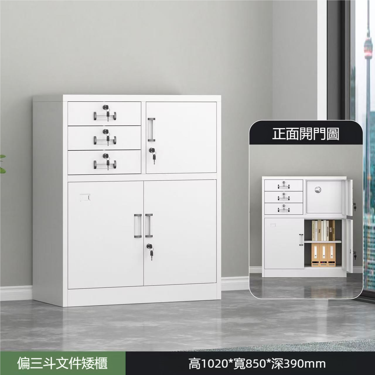 櫃體尺寸為高1020mm、寬850mm、深390mm,適合存放各類文件、資料和其他辦公用品。