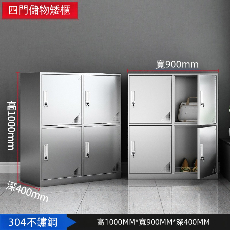 這款不鏽鋼四門儲物矮櫃專為現代辦公室、更衣室等場所設計,結合了高效性與耐用性。其高1000mm、寬900mm、深400mm的尺寸,提供了充足的存儲空間,同時保持了簡潔的外觀。採用高品質304不鏽鋼製造,確保耐用性和安全性。