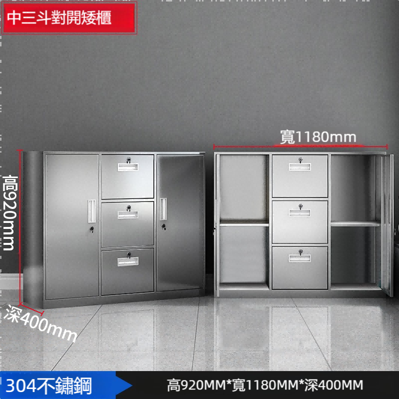 這款中三斗對開矮櫃專為辦公室設計,提供高效的檔案和文件存儲解決方案。其寬1180mm、深400mm、高920mm的尺寸,適合各種辦公環境。採用高品質304不鏽鋼材質,確保耐用性和穩定性。矮櫃設計方便取用,同時節省空間。